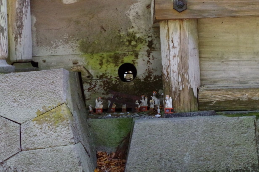 大神山神社奥宮 本殿のお稲荷さんに人為的開けられたキツネの通り道