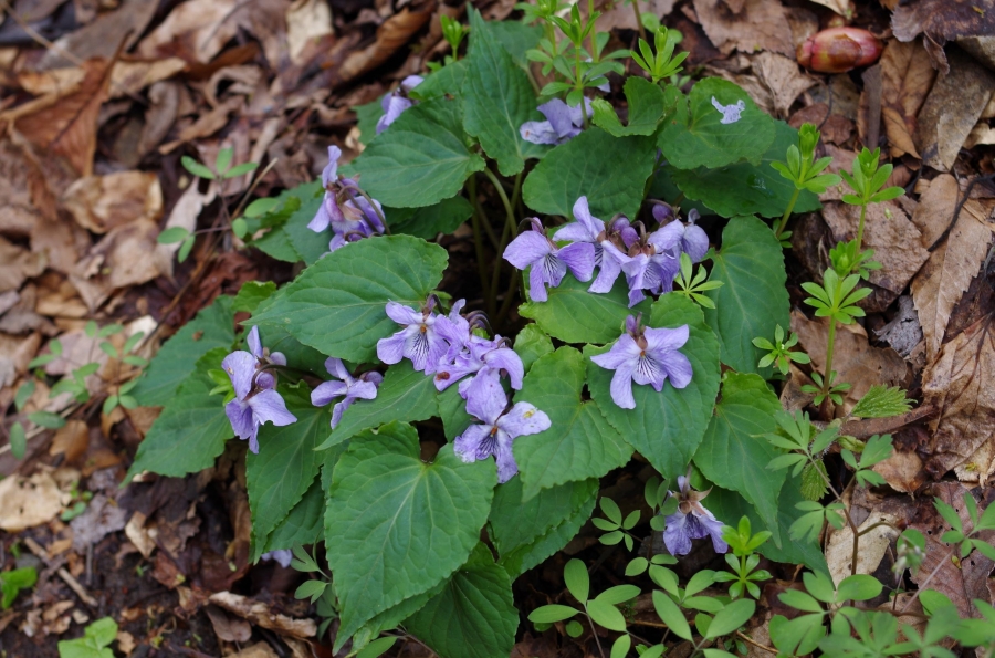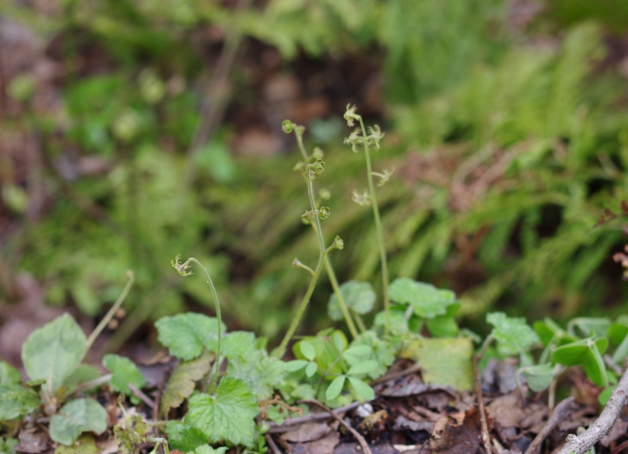 備後からの熟女の皆さま。 野草に詳しい方が多く、チャルメルソウ、芽吹いたばかりの矢車草やサイハイランなど次々と見つけていました。 1週間前からくらべると花の種類も増え、キケマン、ヤマエンゴサク、スミレサイシン、カンアオイ、ネコノメソウ、ワサビ,ムシカリなど見ることができました。 霰も降り7合から上は大山も雪化粧。 気温は6℃と寒い木谷沢でした。