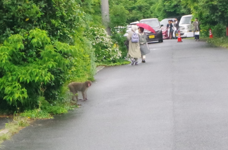 参加ペンションも少なく見るものもなかったが、なんと某ペンションの駐車場からひょっこりお猿さん登場。