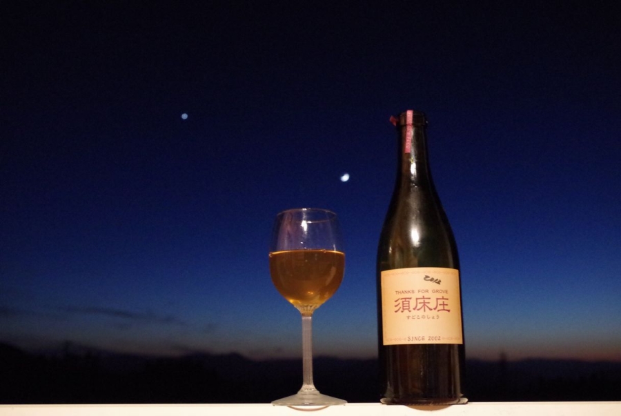西の空に三日月とビーナスを望みながらオリジナルワイン。