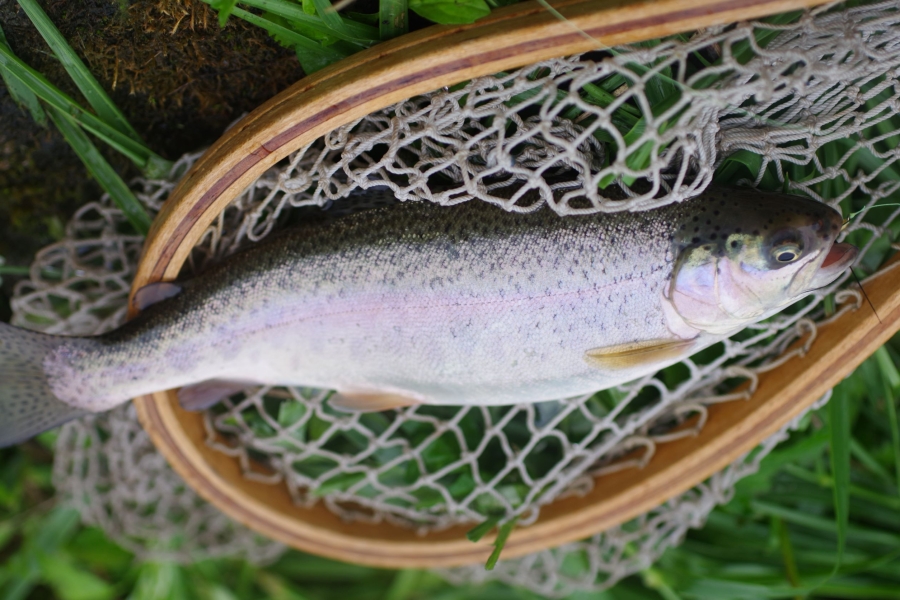 4回目のキャストで尺には満たなかったが良型のレインボー。 強い引きでなかなか手元に寄せることができずラインが木の枝に引っかかり万事休すと思いきやラッキーにもテンションがかかったままの状態でランディングネットに収めることができた。